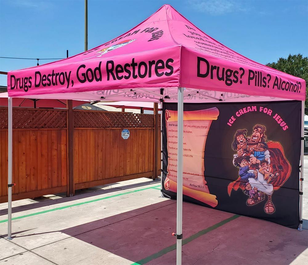 Tents include stakes, tether ropes, and carrying cases with each order. Whether you have print-ready art/graphics for your tent or need help creating some, we are ready to get started with your custom pop-up shade tent project. Call us at (209) 239-2418 today!
